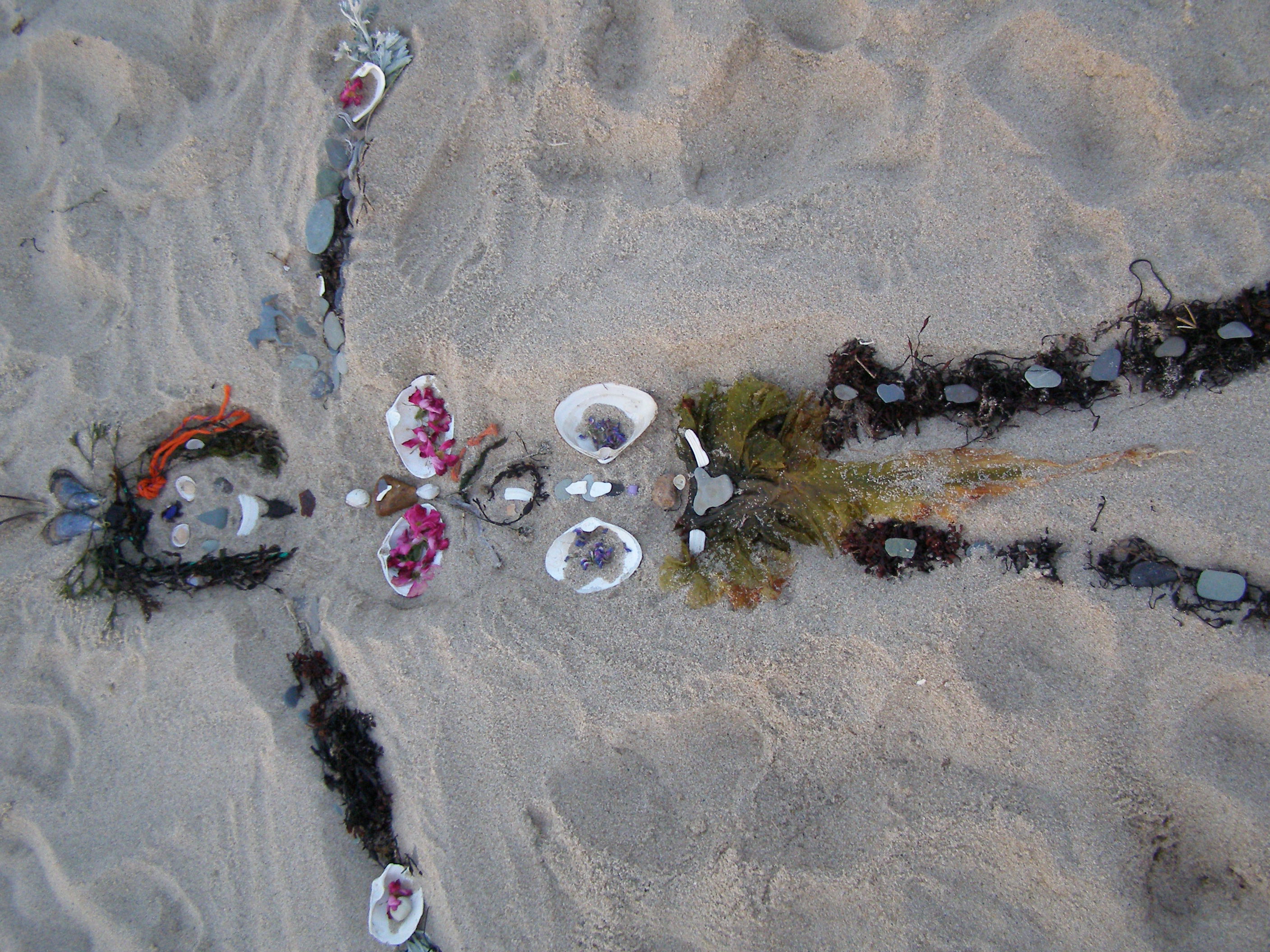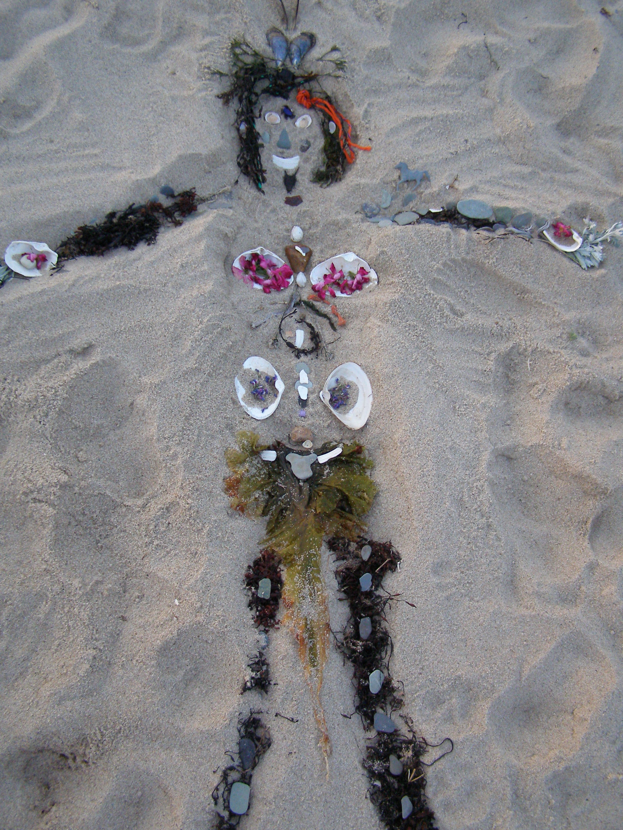 I never completed that ritual. But recently, I had that big birthday. I went to the ocean with my family and on my birthday I lay in the sand and made an impression of my body. Then my kids and I gathered shells, rocks and bits of glass, rope, seaweed, whatever caught our eye, and we made a mermaidish kind of woman- person in the sand. My son made her a skirt that looks a bit like male anatomy. My daughter made her a warrior’s headdress. I found a piece of blue sea glass for a third eye. We made her above the tide line, so she wouldn’t wash away. We checked on her every day and no one on the beach disturbed her body.