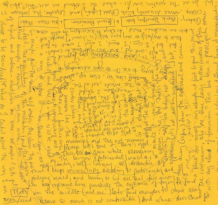 I chewed and chewed and chewed on this sorry state, and one day, as I was doodling, this time on a piece of colored paper (woohoo, big doins!) I began to write, starting at the very edge of the page, creeping along the edge and turning the paper at each corner so that what I was writing began to look like a maze. I wrote and wrote, in teeny handwriting, until I got to the center of the page and could go no further.