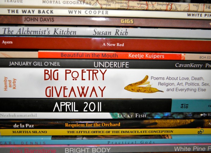 Kelli Russell Agodon over at Book of Kells has once again jumpstarted an extravaganza of poetry love, the Big Poetry Giveaway. Seeing as it’s April, National Poetry Month, and Fool’s Day is safely over, I thought I’d get on board.
